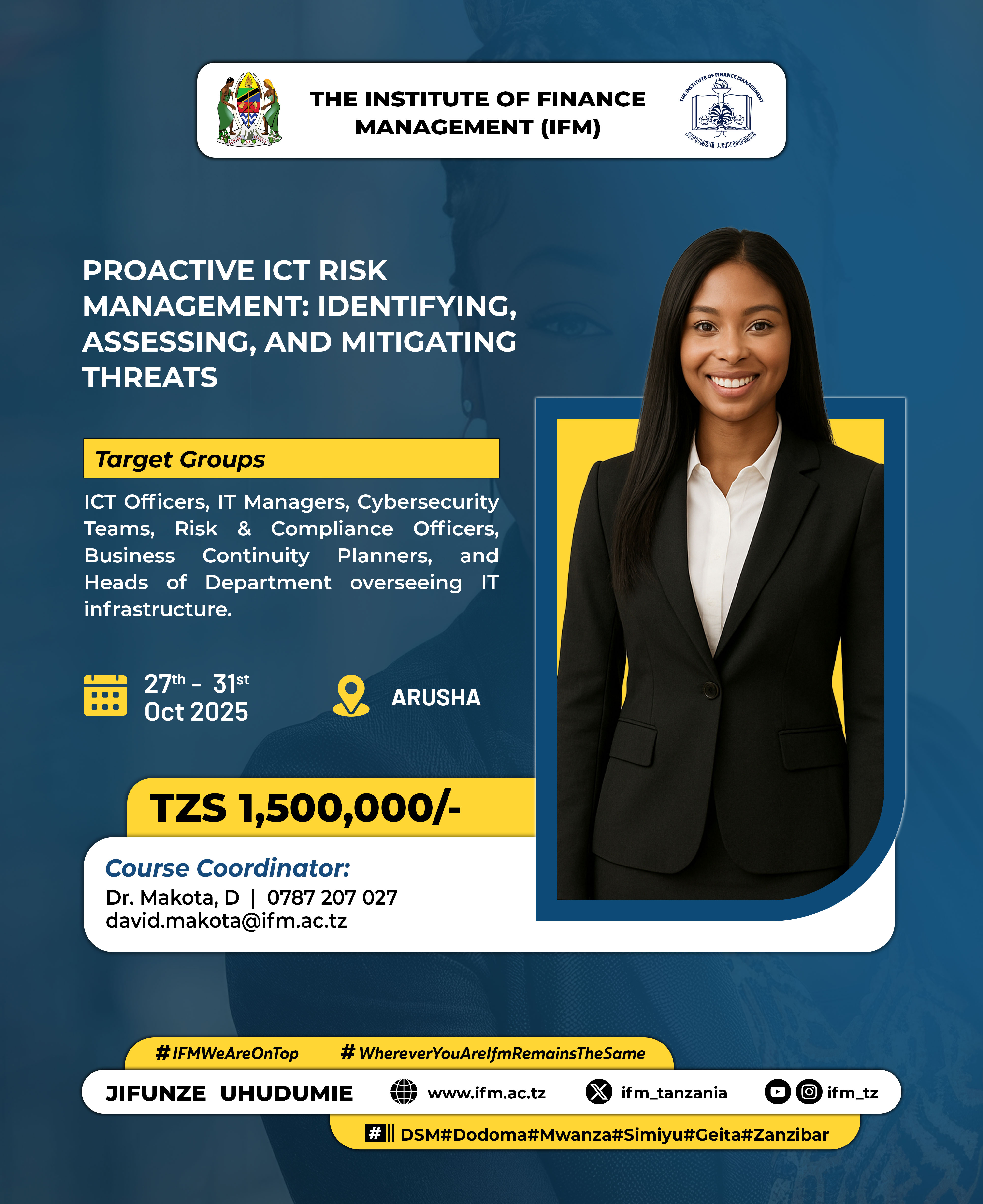 It is my pleasure to welcome you to the Institute of Finance Management (IFM). This is a government higher learning institution established in 1972 to provide training, research and consultancy services in banking, insurance, social protection, taxation, accountancy and other business related disciplines. The Institute has a favourable learning environment for students who join to pursue our programs at different... Read More